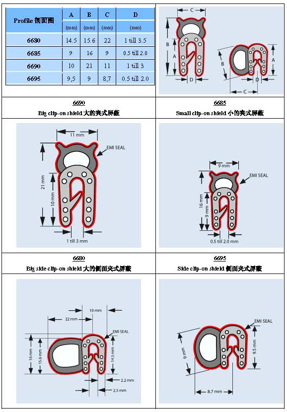 夾式屏蔽墊圈是一個柔軟的橡膠管帶一個全金屬包層。該夾式系列是極其容易裝配的,提供一個固體的機械EMI屏蔽墊圈附件而沒有使用黏合劑的。