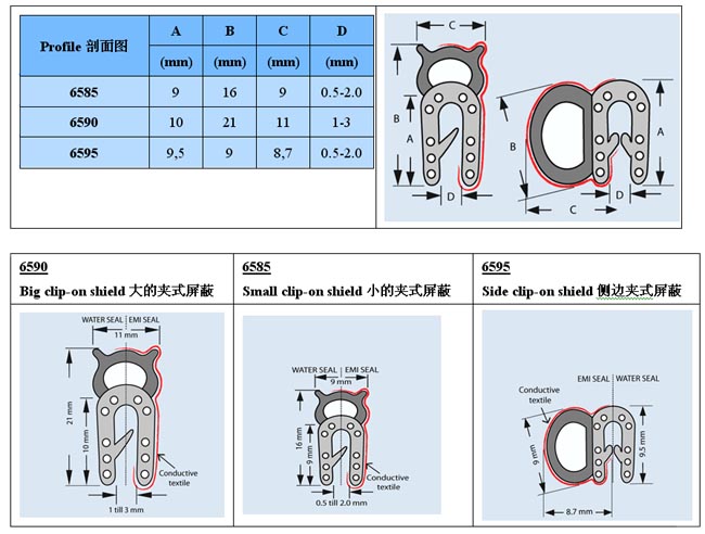 這個系列的容易裝配的夾式墊圈由一個分開的海綿狀橡皮水封和一個EMI屏蔽側(cè)邊的高度導(dǎo)電的,抗磨損的用金屬處理的織物組成。結(jié)構(gòu)是非常軟的由于是空的橡膠,因此確保了一個低的閉合力。