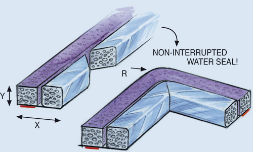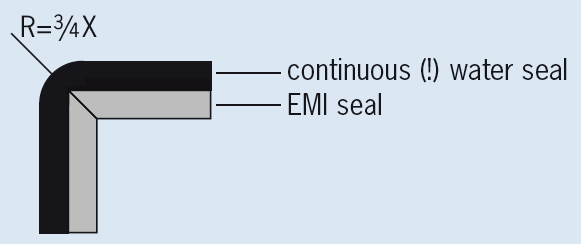 The gasket consists of two neoprene foam cores, one of which is covered with reinforced foil, based on the high performance Amucor alloy. Amucor is good compatible with aluminium and zinc plated steel. For aluminium with alochrome or stainless steel it is better to use highly conductive textile. The two parts can deflect independently to guarantee optimal shielding and sealing performance. Sharp inside corners can be made easily, without interrupting the water seal. For special applications, different foam cores and conductive foils and fabrics are available.